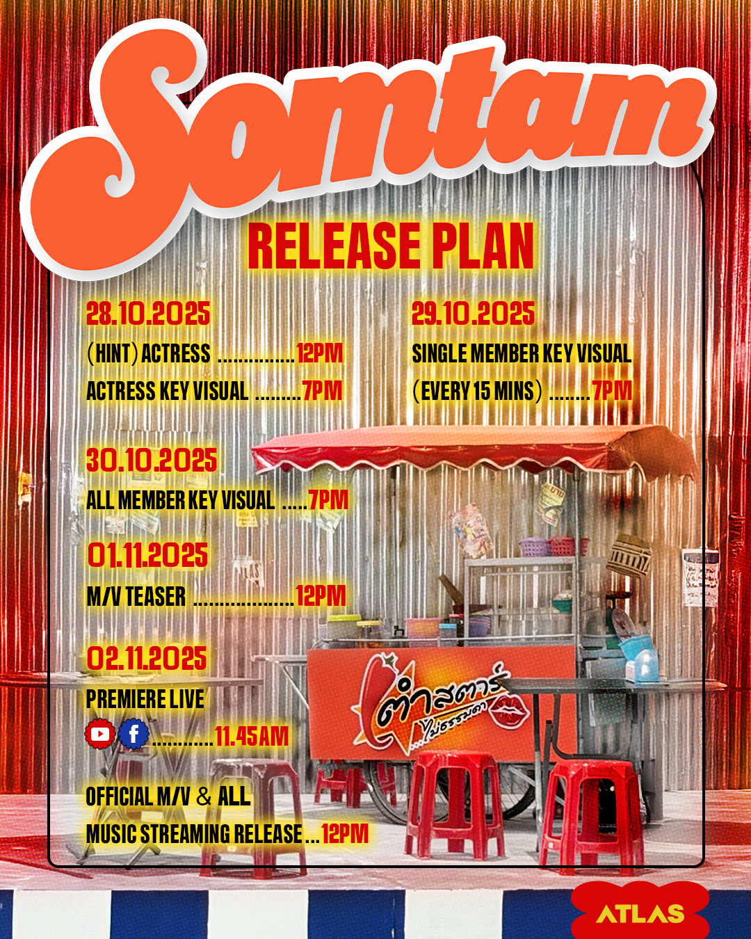 “ATLAS” ขอเล่นใหญ่ เสิร์ฟซิงเกิลใหม่ล่าสุด “SOMTAM” พร้อมดึงดาราสาว “Janistar” มารับบทนางเอก MV เกาะจอรอรับชมพร้อมกันที่ OFFICIAL MV / ALL MUSIC STREAMING วันที่ 2 พฤศจิกายนนี้ “ATLAS” นับเป็นอีกวงใน T-POP ที่ไม่ได้เกิดมาแค่เพื่อร้องเล่นเต้นโชว์ แต่พวกเขาเกิดมาเพื่อสร้างตำนาน ที่บอกเลยว่าไม่ใช่ไม่ซ้ำ แต่ถึงขั้นจำไม่ได้! ก่อนหน้านี้ “ATLAS” เคยปล่อยซิงเกิล “Mangosteen (มังคุด)” เรียกเสียงฮือฮาให้แฟนๆ ได้ไม่น้อยเลยทีเดียว และยิ่งไปกว่านั้นยังมีเนื้อเพลงท่อนฮิตติดหูอย่าง “แม่ใช้ไปซื้อมังคุด แต่หยิบละมุดทำไมไม่รู้” อีกด้วย เรียกได้ว่าร้องฮึมฮัมกันได้ทุกคนหลังจากฟังเพลงไป ครั้งนี้ “ATLAS” ขอกลับมารันวงการใหม่อีกครั้ง ด้วยซิงเกิลใหม่ล่าสุด “SOMTAM (ส้มตำ)” ในคอนเซปต์ร้านส้มตำข้างทาง แต่จัดจ้านสะท้านไปถึงทรวงใน จากวงมังคุด สู่วงส้มตำ และที่พิเศษใส่ไข่มากกว่าครั้งไหนๆ ก็คือการคว้าดาราสาวที่กำลังมีกระแสในช่วงนี้อย่าง “Janis Janistar” มาเป็นนางเอก MV นอกจากการได้ทำงานร่วมกันแล้ว ถือเป็นการทำบุญใหญ่ให้แฟนๆ ได้เชยชมพี่สาวคนสวยในลุคแซ่บๆ หลังจากสวมบทบาทเขมมิกา ในซีรีส์ “เขมจิราต้องรอด” มาอาบน้ำแต่งตัวแล้วร้อนแรงไม่แพ้ส้มตำพริก 10 เม็ด เลยทีเดียวเชียวล่ะ! ซึ่งทางด้านเมมเบอร์ ATLAS ก็ไม่พลาดที่จะออกมาแซวเรียกเสียงฮาสนั่นโซเชียลว่า “ขอบคุณพี่เจนิสที่อาบน้ำใหญ่ออกจากบ้าน” โดยนอกจากความแซ่บของเพลงและนางเอก MV แล้ว อีกประเด็นที่น่าสนใจคือการที่หนุ่มๆ “ATLAS” หยิบ “ส้มตำ” ที่เป็นหนึ่งใน Soft Power ไทยที่ดังไปไกลทั่วโลก มาชูโรงในเพลงนี้อีกด้วย ส่วนทางด้านแฟนๆ หรือ “ALIS” (เอลิส) ต่างพากันออกมาแซวยกใหญ่ ว่าจากสมัยซิงเกิลมังคุดที่โปรโมทผ่านการยกมังคุดมาแจกเป็นตะกร้า แล้วคราวนี้ “ATLAS” จะขนส้มตำมาแจกทั้งถาดเลยไหมคะเนี่ย งานนี้บอกเลยว่าอยากได้อะไรใหม่ๆ ให้ลองมาเป็น ALIS! (เพราะถ้าไม่ใช่ ATLAS แล้วใครจะทำล่ะ) ATLAS พร้อมเปิด “ร้านตำสตาร์… ไม่ธรรมดา” ให้ทุกคนได้มาลองลิ้มลองพร้อมกันแล้ววันนี้! รอรับชมรับฟังความแซ่บของ “ATLAS” และ “Janistar” ผ่าน OFFICIAL MV / ALL MUSIC STREAMING วันที่ 2 พฤศจิกายนนี้เวลา 12.00 น.