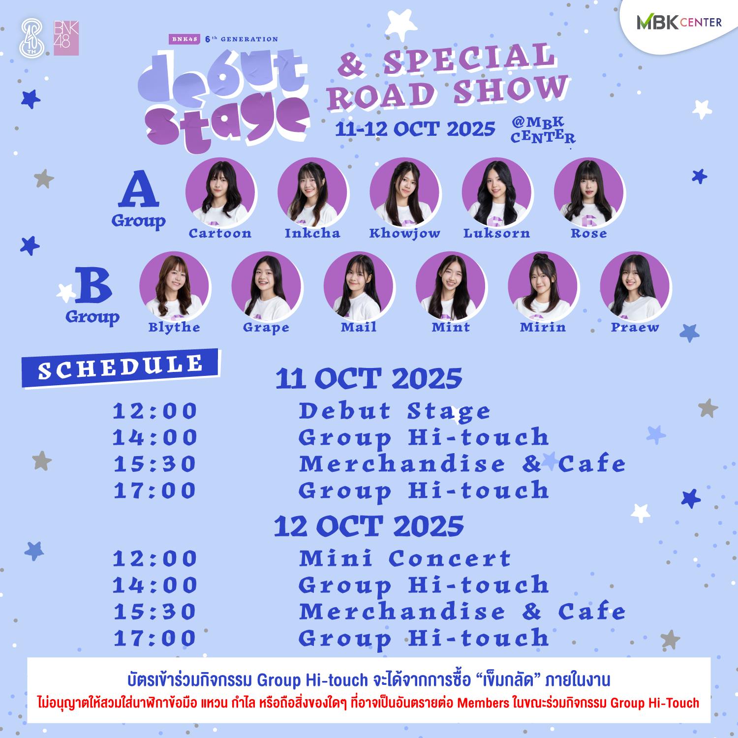 หลังจากที่แฟนๆ เลี้ยงดูฟูมฟักกันมาตั้งแต่เป็นเทรนนี ในที่สุดก็ถึงเวลาเอาชนะความกลัวเพื่อออกมาเฉิดฉายของรุ่น 6! แล้วมาเชียร์น้องๆ รุ่น 6 ด้วยกัน วันที่ 11-12 ตุลาคมนี้ ที่ MBK Center