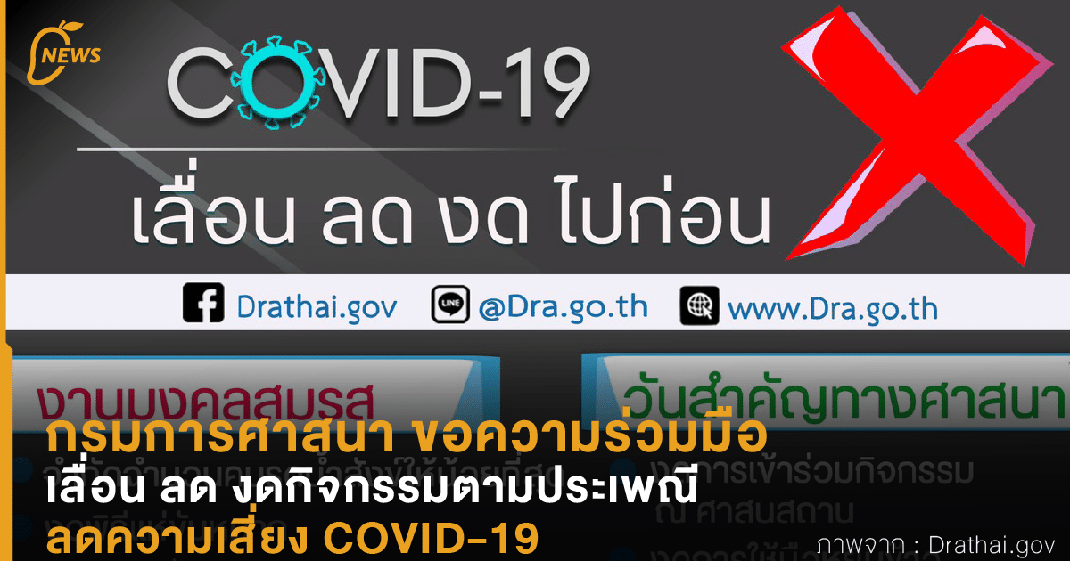 กรมการศาสนา ขอความร่วมมือเลื่อน ลด งดกิจกรรมตามประเพณีที่มีการรวมตัวกัน เพื่อลดความเสี่ยง COVID-19 ภายใต้ชื่อ “COVID-19 เลื่อน ลด งด ไปก่อน” โดยมีรายละเอียดของกิจกรรมแต่ละอย่าง ดังนี้ ประเพณีสงกรานต์ งดจัดงานสงกรานต์ งดเดินทางกลับภูมิลำเนา ขอพรทางสื่อออนไลน์ งานมงคลสมรส จำกัดจำนวนคนรดน้ำสังข์ให้น้อยที่สุด งดพิธีแห่ขันหมาก งานพิธีการศพ ลดจำนวนวันตั้งบำเพ็ญกุศลให้น้อยที่สุด จำกัดคนเข้าร่วมพิธีฌาปนกิจให้น้อยที่สุด และอยู่ห่างกัน 2เมตร วันสำคัญทางศาสนา งดการเข้าร่วมกิจกรรม ณ ศาสนสถาน งดการใช้มือหยิบข้าวใส่บาตรพระภิกษุ เทศกาลไหว้บรรพบุรุษ งดการเดินทางไปไหว้บรรพบุรุษ ณ สุสาน ที่มา: Drathai.gov