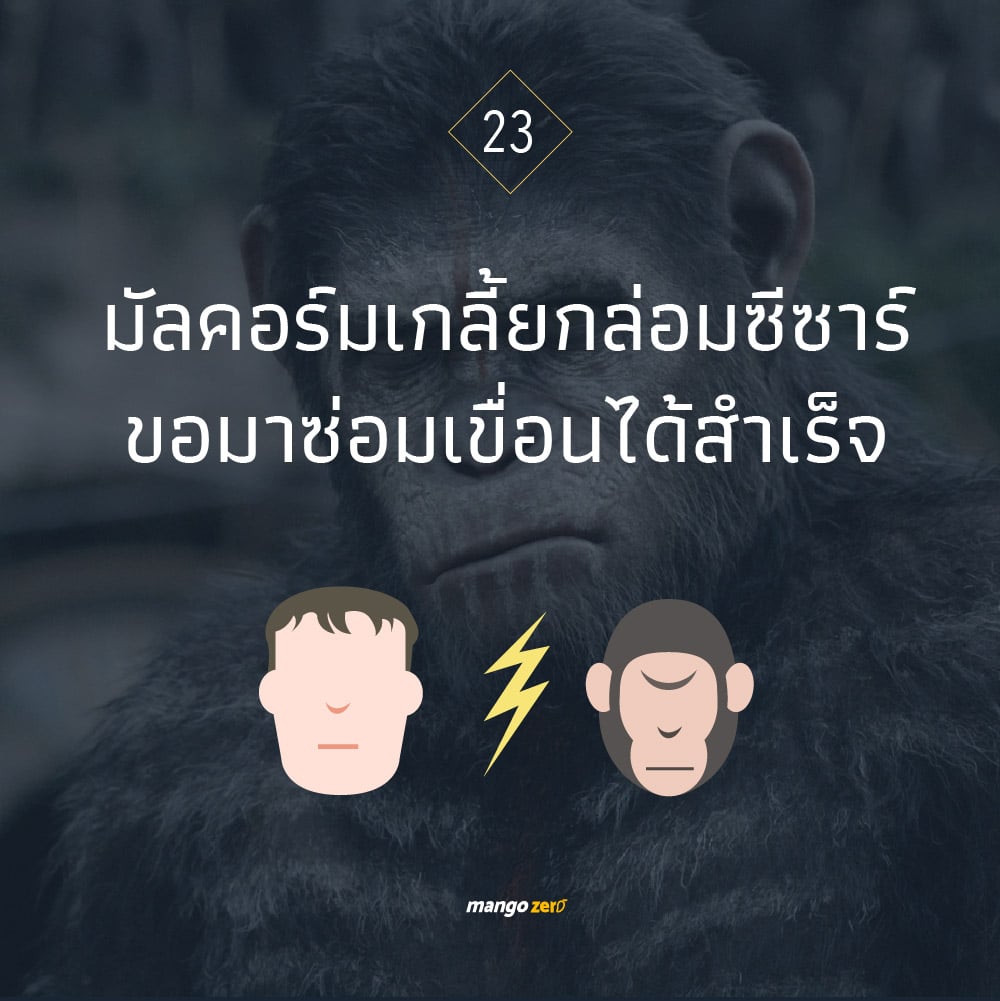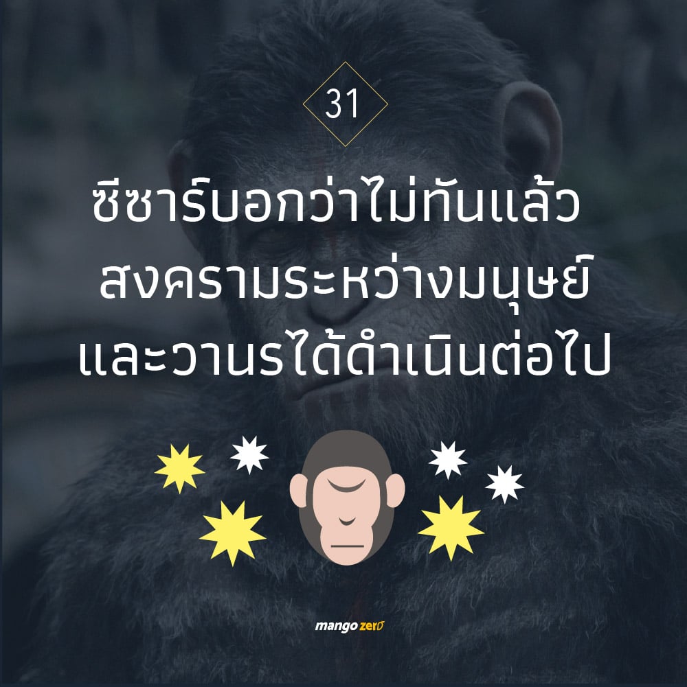 หนังสงครามระหว่างลิงกับมนุษย์ ภาคต่อของ The Rise of the Planet of the Apes (2011) และ Dawn of the Planet of the Apes เข้าฉายแล้ววันนี้ ใครหลงๆ ลืมๆ ภาคก่อนหน้า หรืออยากดูภาคนี้แต่ไม่รู้เรื่องราวก่อนหน้ามาก่อน ลองอ่านสรุปทั้งสองภาคแบบคร่าวๆ เตือนความจำและปูเรื่องเพื่อเตรียมตัวไปดูสงครามเต็มรูปแบบของ War for the Planet of the Apes กัน หนังชุดต้นฉบับ Planet of the Apes มีมาตั้งแต่ปี 1968 – 1973 ซึ่งประสบความสำเร็จอย่างมากจนมีการนำกลับมาสร้างในปี 2001 (เป็นภาคแยกสร้างโดยป๋าทิมเบอร์ตัน ซึ่งเนื้อเรื่องมีเค้าโครงจากภาค 1968 แต่เรื่องราวไม่ได้เชื่อมเรื่องกับภาคใดๆ) หลังจากนั้น จึงมีการนำกลับมารีบูทใหม่ในปี 2011 โดยเล่าถึงเหตุการณ์ก่อนหน้าที่เหล่าวานรจะเข้ามายึดครองโลกว่ามีที่มาที่ไปยังไง โดยเล่าเรื่องในมุมมองใหม่และทฤษฎีใหม่เกือบทั้งหมด ใครกำลังจะไปดู War for the Planet of the Apes ก็สามารถเริ่มดูได้ตั้งแต่ภาค Rise of the Planet of the Apes และ Dawn of the Planet of the Apes ที่เราได้รวบรวมเนื้อเรื่องแบบคร่าวๆ มาให้ดูกัน (อาจมีเนื้อหา Spoiled) . . มนุษย์นำลิงมาทดลองเพื่อรักษาโรคอัลไซเมอร์ เป็นบริษัทที่วิลพระเอกของเรื่องทำงานอยู่ ผลลัพธ์ออกมาล้มเหลว ลิงที่นำมาทดลองมีสติปัญญาและพัฒนาการอย่างรวดเร็ว แต่ระหว่างการนำเสนอผลงาน ลิงเกิดคลุ้มคลั่งกลางห้องประชุมทำให้โปรเจคถูกยกเลิกไป มาพบภายหลังว่าสาเหตุที่ลิงคลุ้มคลั่งเพราะมันมีลูกและมันหวงลูกของมัน ซึ่งลูกลิงตัวนั้นคือ ซีซาร์ นั่นเอง แต่วิวัฒนาการของลิงมีสติปัญญาฉลาดขึ้น วิลรับซีซาร์ไปเลี้ยงและดูแลเหมือนลูก เนื่องจากโปรเจคล่ม ลิงทุกตัวในห้องทดลองจึงถูกเก็บทั้งหมด ซีซาร์เป็นลูกลิงที่เหลือรอดเพราะความสงสารวิลจึงรับซีซาร์มาเลี้ยงที่บ้านตนเอง โดยพ่อของวิลที่เป็นโรคอัลไซเมอร์คอยดูแลด้วย เกิดเหตุการณ์เข้าใจผิดทำให้ซีซาร์ต้องไปอยู่สถานกักกันสัตว์ เมื่อซีซาร์เติบโตขึ้นและมีสติปัญญาฉลาดแทบเทียบเท่ามนุษย์ วิลได้เล่าที่มาที่ซีซาร์มาอยู่กับเขาและทำไมซีซาร์ถึงมีสติปัญามากกว่าลิงทั่วไป ทำให้ซีซาร์มีความคิดต่อต้านการเป็นสัตว์เลี้ยงอยู่หน่อยๆ และต้องการได้รับการปฏิบัติเท่าเทียมกับมนุษย์ จนกระทั่งเกิดเหตุการณ์เข้าใจผิดไปทำร้ายคนเข้า ทำให้ต้องถูกจับไปอยู่สถานกักกันสัตว์ หลังจากถูกทารุณและรู้สึกถูกทอดทิ้ง ซีซาร์ถูกทารุณและกลั่นแกล้ง และได้พบเห็นความโหดร้ายของมนุษย์ที่กดขี่ข่มเหงวานร ซีซาร์ก็หมดความเชื่อใจต่อมนุษย์และหลบหนีออกมาจากสถานกักกัน วิลที่สัญญาว่าจะมารับซีซาร์กลับบ้านก็ไม่ยอมกลับมารับ และการกลั่นแกล้งจากคนในสถานกักกันยังดำเนินต่อไป ซีซาร์ซึ่งเป็นล