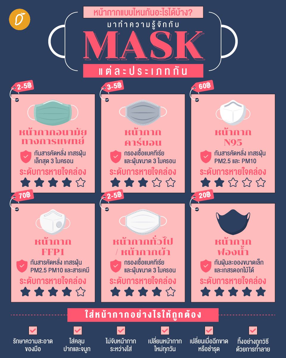 เมื่อการใส่หน้ากาก (จริงๆ) เข้าหากันในชีวิตประจำวันได้กลายเป็นเรื่องปกติ ทำให้การเลือกใช้หน้ากากอนามัย กลายเป็นอีกหนึ่งเรื่องที่ต้องให้ความสำคัญ วันนี้ค่าฝุ่นเยอะต้องใช้อันนี้ หรือหากจำเป็นต้องผ่านพื้นที่เสี่ยง ก็ต้องเปลี่ยนไปใช้อีกอันหนึ่ง คำถามที่ตามมาก็คือ แล้วอันไหนล่ะถึงจะเหมาะสมที่สุด? วันนี้ Mango Zero จะพาทุกคนมาทำความรู้จักกับหน้ากากอนามัยแต่ละประเภทกัน หน้ากากอนามัยทางการแพทย์ ที่ได้ชื่อว่าเป็นหน้ากากทางการแพทย์ ก็เพราะสามารถป้องกันโรคที่เกี่ยวกับระบบทางเดินหายใจ ซึ่งเป็นวิธีการป้องกันการแพร่กระจายของเชื้อแบคทีเรียหรือเชื้อไวรัสจากคนสู่คนได้ถึง 99% แต่เนื่องจากหน้ากากประเภทนี้มีความขาดแคลนบ้างในบางครั้ง หากเป็นไปได้ ก็ควรให้ทางการแพทย์ได้ใช้ก่อน และเลี่ยงไปใช้ประเภทอื่นแทน วิธีใช้ : นำด้านสีเขียวออกด้านหน้า โดยให้ขอบแข็งอยู่ด้านบน โอกาสในการใช้ : ส่วนใหญ่ใช้ในทางการแพทย์ อาทิ ตรวจคนไข้ แต่คนทั่วไปสามารถใช้ในชีวิตประจำวันได้เช่นเดียวกัน กันอะไรได้บ้าง : กันสารคัดหลั่ง ป้องกันเกสรฝุ่นและดอกไม้ได้ขนาดเล็กสุดถึง 3 ไมครอน และหากใส่ 2 แผ่น จะกันได้มีประสิทธิภาพถึง 89.75% ระดับการหายใจคล่อง : 4/5 ราคา ชิ้นละ 2-5 บาท หน้ากากคาร์บอน มีคุณสมบัติเหมือนกับหน้ากากอนามัยทางการแพทย์ แต่จะเพิ่มชั้นคาร์บอนที่ช่วยกรองกลิ่นได้ดียิ่งขึ้น วิธีใช้ : นำด้านสีเทาเข้มออกด้านหน้า โดยให้ขอบแข็งอยู่ด้านบน โอกาสในการใช้ : ใช้ในชีวิตประจำวันในวันที่ต้องพบปะผู้คน หรือไปในสถานที่ที่ไม่พึงประสงค์ กันอะไรได้บ้าง : กรองเชื้อแบคทีเรียได้ถึง 95% กรองฝุ่นละอองขนาด 3 ไมครอนได้ 66.37% และถ้าสวมใส่ 2 แผ่น จะกันได้ มีประสิทธิภาพถึง 89.75% ระดับการหายใจคล่อง : 3/5 ราคา : ชิ้นละ 3 – 5 บาท หน้ากาก N95 เมื่อมีตัวเลขเข้ามาเกี่ยวข้อง ทำให้ดูมีความเป็นวิทยาศาสตร์ขึ้นอีกเล็กน้อย หน้ากาก N95 มีประสิทธิภาพสูงกว่าหน้ากากทั่วไปๆ สามารถป้องกันอนุภาคขนาดเล็กมากๆ ได้ เพราะมีรูปแบบครอบปากและจมูกอย่างมิดชิด วิธีใช้ : นำด้านที่รองรับสันจมูกขึ้น บางแบรนด์อาจมีสายรัดด้านหลังเพื่อการปิดที่แน่นหนามากยิ่งขึ้น โอกาสในการใช้ : ใช้ในวันที่ไม่ต้องทำกิจกรรมหนักๆ หรือไปในสถานที่ที่มี PM2.5 สูง กันอะไรได้บ้าง : กันสารคัดหลั่ง เกสรฝุ่นและดอกไม้ PM2.5 และ PM10 ระดับการหายใจคล่อง : 2/5 ราคา : ชิ้นละประมาณ 60 บาทขึ้นไป หน้ากาก FFP1 มีรูปทรงคล้ายหน้ากาก N95 แต่นอกจากจะสามารถกันฝุ่น PM2.5 และ PM10 ได้แล้ว ยังสามารถกันสารเคมีได้อีกด้วย โดยสำหรับตัวนี้ บางรุ่นจะมีลิ้นระบายลมให้หายใจออก และช