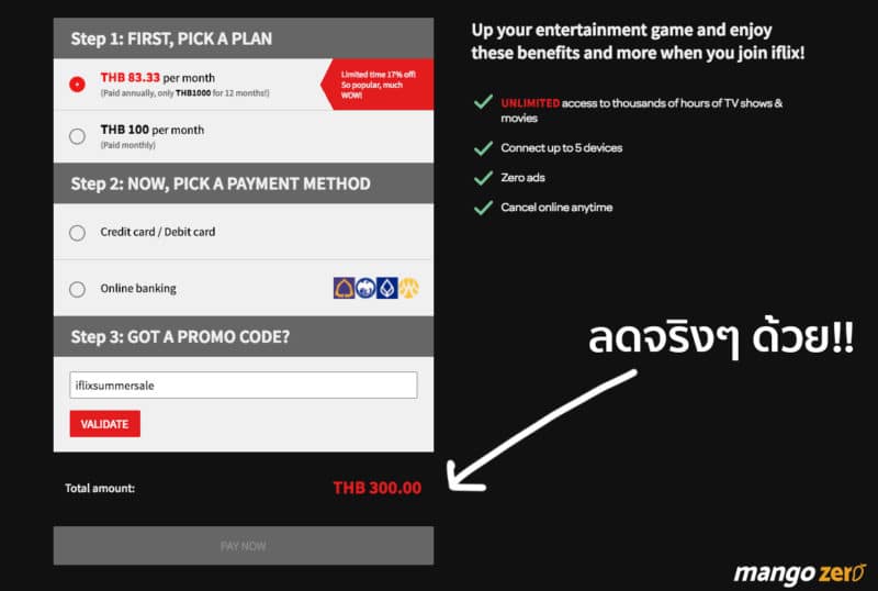 เว็บไซต์ดูหนัง – ซีรีย์ ออนไลน์ iflix ออกโปรที่โคตรร้อนแรงแข่งกับอากาศที่ร้อนแรงเหมือนกันนั่นคือสมัครแพ็คเกจดูหนังแบบหนึ่งปีราคาเพียง 300 บาทต่อปีเท่านั้นจากปกติปีล่ะ 1,000 บาท สำหรับคนที่สนใจจะลองใช้ส่วนลดมหากาฬของ iflix นั้นเงื่อนไขง่ายมากเพียงแค่ใส่โค้ดส่วนลด ‘iflixsummersale’ ตอนจ่ายเงินเพื่อสมัครสมาชิก โดยเลือกแบบ 83.33 บาท/เดือน ไปเลย จากนั้นระบบจะทำการปรับส่วนลดลงอัตโนมัติ ซึ่งจากเดิมอัตราสมาชิกต่อปีจะอยู่ที่ 1,000 บาท แต่พอใส่โค้ดไปปุ๊บ ระบบจะปรับให้เหลือ 300 บาท หรือคิดป็นส่วนลดถึง 70% เลยทีเดียว เฉลี่ยแล้วก็เดือนล่ะ 25 บาท ถ้าคิดเป็นวันยิ่งถูกลงไปอีกคือวันล่ะไม่ถึง 1 บาทเท่านั้นถูกแบบไม่ไหวแล้ว ส่วนหนัง หรือซีรีย์ที่ได้ดูนั้นก็ไม่บล็อกดูได้เต็มๆ แบบไม่ยั้งทุกเรื่อง ที่น่าสนใจคือส่วนลดนี้จะใช้ซ้ำกี่ครั้งก็ได้ สมมติสมัคร 10 ปีก็แค่ 3,000 บาทเท่านั้น แต่โปรโมชั่นลดที่โคตรร้อนแรงระดับนี้หมดเขต 15 พฤษภาคมนี้เท่านั้น สมัครเลยให้ไว! สมัครเลยที่นี่ ifilx ลดอย่างเถื่อน