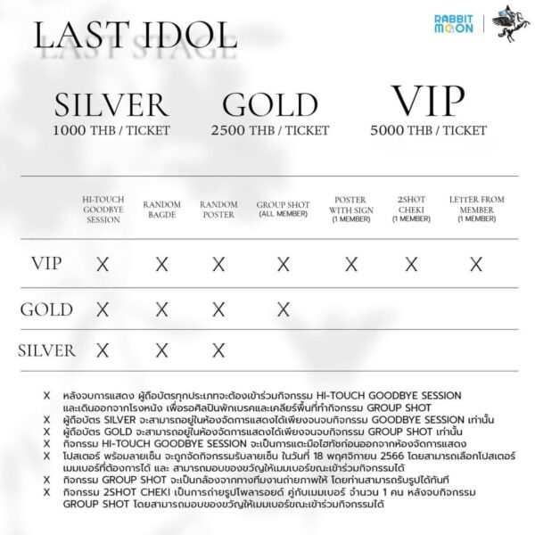 จบเกมนี้ แค่รอเริ่มเกมใหม่ก็เท่านั้น Rabbit Moon ประกาศจัดงาน “LAST STAGE” คอนเสิร์ตสุดท้ายของ LAST IDOL THAILAND ก่อนยุติบทบาทวง วันที่ 19 พฤศจิกายน 2566 ณเมเจอร์ซีนีเพล็กซ์รัชโยธิน เกมสุดท้ายใครบอก มันไม่มีหรอก~ แม้จะประกาศยุติบทบาทวงอย่างเป็นทางการไปเป็นที่เรียบร้อยแล้ว แต่เส้นทางของ 21 สาวผู้กล้าแห่ง “LAST IDOL THAILAND” ยังมีต่ออีกยาวไกล วันนี้เป็นเพียงแค่การบอกลาปักหมุดหมายใหม่เพื่อเดินหน้าต่อไปเท่านั้น เหมือนดั่งเช่นเนื้อหาที่ 2 เพลงความหมายดีๆ จากซิงเกิลลำดับที่ 3 กล่าวไว้ ทั้ง “LAST GAME เกมสุดท้าย… ไม่มีจริง” ที่มีพี่ใหญ่ของวง ตำนานแห่งวงการไอดอลไทย “ม่านมุก” รับตำแหน่งเซ็นเตอร์ ตามด้วยเพลง “La La Last Idol” ซึ่งมี “ต้นน้ำ” สาวน้อยหมวกแดงในวันวาน ผู้เป็นดั่งภาพลักษณ์ของวง ณ วินาทีเริ่มต้น มารีบหน้าที่เซ็นเตอร์เช่นเดียวกัน โดยในวันที่ 19 พฤศจิกายน 2566 จะมีการจัดคอนเสิร์ต “LAST STAGE” เป็นเวทีอำลา ณ เมเจอร์ ซีนีเพล็กซ์ รัชโยธิน เพื่อบันทึกเรื่องราวกว่า 2 ปีบนเส้นทางไอดอลเป็นความทรงจำร่วมกับเหล่าแฟนๆ งานนี้ ม่านมุก เซ็นเตอร์คนเก่งประจำเพลงนี้ได้ฝากข้อความทิ้งท้ายกับแฟนคลับไว้ว่า “ทุกงานเลี้ยงย่อมมีวันเลิกราค่ะ กับ LAST IDOL FAMILY มันเป็นความทรงจำที่ดีและสวยงามมากๆ เลยค่ะ มุก กับน้องๆ จะพูดเสมอว่า แฟนคลับทุกคนมีส่วนสำคัญกับพวกเราตั้งแต่ถ่ายทำรายการ LAST IDOL THAILAND จนพวกเราได้เดบิวต์ออกซิงเกิลด้วยกัน ใน BANDWAGON ซึ่งเป็นเพลงแรกในนาม LAST IDOL” “และตอนนี้การเดินทางในบทบาทของ ไอดอล ของพวกเราใกล้จะสิ้นสุดลง กับ “LAST STAGE” คอนเสิร์ตสุดท้ายที่ Member ทุกคนตั้งใจเตรียมการแสดงมาเพื่อแฟนคลับ มุก อยากให้ทุกคนมาเป็นความทรงจำที่ดีให้กับพวกเราค่ะ” “LAST STAGE LAST IDOL” เปิดจำหน่ายบัตรแล้วตั้งแต่วันนี้ แบ่งบัตรออกเป็น 3 แพคเกจด้วยกัน ได้แก่ Silver Package 1,000 บาท / Gold Package 2,500 บาท / VIP Package 5,000 บาท จองบัตรได้ที่ shop.lastidol นอกจากนี้ยังสามารถตามเก็บทุกเรื่องราวการเดินทางก่อนถึงวันลา ได้ที่ช่องทางโซเชียลมีเดียต่างๆ Facebook : LAST IDOL THAILAND Instagram : lastidol_th รวมถึงติดตามข่าวสารเพิ่มเติมได้ที่ช่องทางอย่างเป็นทางการของค่าย Rabbit Moon Facebook : rabbitmooncorp Instagram : rabbitmooncorp YouTube : @RabbitMoonCorp TikTok : @rabbitmooncorp Twitter : rabbitmooncorp