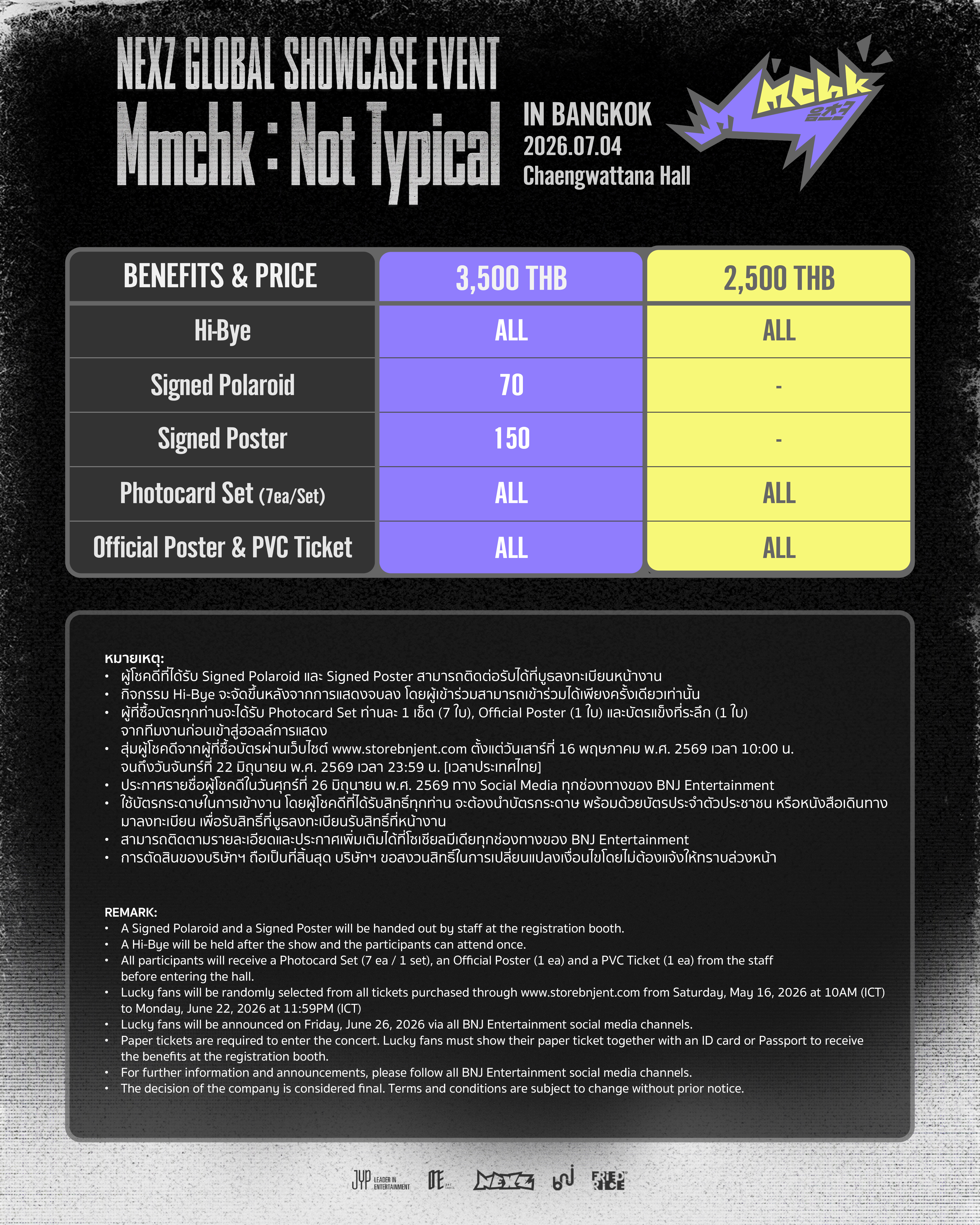 หนุ่มๆ ไอดอล NEXZ (เน็กซ์จี) ภายใต้สังกัด JYP Entertainment พร้อมบินลัดฟ้ามาหาแฟนๆ ไทยกับงานโชว์เคสสุดพิเศษครั้งแรก กับงาน “NEXZ GLOBAL SHOWCASE EVENT <Mmchk : Not Typical> in BANGKOK” โดยผู้จัดคุณภาพอย่าง BNJ Entertainment และ FriedRice Entertainment ที่จะจัดขึ้นในวันที่ 4 กรกฎาคม 2569 ณ แจ้งวัฒนะ ฮอลล์ NEXZ แจ้งเกิดจากรายการออดิชันชื่อดัง Nizi Project Season 2 ในปี 2023 ภายใต้คอนเซ็ปต์ Next Z (G)eneration ที่ตั้งเป้านำเสนอพลังของคนรุ่นใหม่ผ่านดนตรีและการแสดงที่ไม่ซ้ำใครพวกเขาเปิดตัวในปี 2024 กับอัลบั้ม Ride the Vibe และเดินหน้าปล่อยผลงานต่อเนื่อง ไม่ว่าจะเป็น Keep on Moving, NALLINA, O-RLY?, One Bite และ Beat-Boxer พร้อมคว้ารางวัล “ASEA THE BEST NEW ARTIST” จาก Asia Star Entertainer Awards 2025 ตอกย้ำความแรงในฐานะศิลปินหน้าใหม่ที่น่าจับตามองที่สุดในเอเชีย หนุ่มๆ NEXZ (เน็กซ์จี) ประกอบด้วยสมาชิก 7 คน ได้แก่ โทโมยะ (TOMOYA), ยู (YU), ฮารุ (HARU), โซกอน (SO GEON), เซย์ตะ (SEITA), ฮยูอิ (HYUI) และ ยูกิ (YUKI) NEXZ พร้อมบินลัดฟ้ามาหาแฟนๆ NEX2Y ชาวไทยกับโชว์เคสสุดพิเศษครั้งแรกและ NEXZ GLOBAL SHOWCASE EVENT <Mmchk : Not Typical> in BANGKOK ครั้งนี้กลับมาครั้งนี้มาพร้อมซิงเกิลอัลบั้มชุดที่ 2 “Mmchk” ที่กำลังเป็นกระแสร้อนแรง ด้วยคอนเซ็ปต์สุดยูนีคที่สะกดทุกสายตา และซาวด์ดนตรีที่สะท้อนตัวตนของวงได้อย่างชัดเจน โดยในอัลบั้มประกอบด้วย 3 แทร็ก ได้แก่ “Mmchk” , “HYPEMAN” และ “Mmchk (English Version)” พร้อมโชว์ศักยภาพทางดนตรีของสมาชิก เมื่อ YUKI, HYUI และ TOMOYA มีส่วนร่วมในการเขียนเนื้อเพลง เรียกได้ว่าเป็นอีกหนึ่งศิลปินรุ่นใหม่ที่มากฝีมือและโดดเด่นแบบสุดๆ ก่อนหน้านี้ NEXZ ได้ปล่อยคอนเทนต์ทีเซอร์ผ่านโซเชียลมีเดีย สร้างกระแสความตื่นเต้นไปทั่วโลก และต่อยอดสู่การจัด GLOBAL SHOWCASE ในหลายเมืองสำคัญของเอเชีย ไม่ว่าจะเป็น ไทเป, ฮ่องกง และกรุงเทพฯ ซึ่งถือเป็นอีกหนึ่งเป้าหมายสำคัญของการขยายฐานแฟนคลับในระดับสากล งาน NEXZ GLOBAL SHOWCASE EVENT <Mmchk : Not Typical> in BANGKOK ครั้งนี้ จึงถือเป็นโอกาสสำคัญที่แฟนๆ ชาวไทยจะได้สัมผัสเสน่ห์แบบ “Not Typical” ของทั้ง 7 หนุ่มแบบเป็นกันเอง บัตรราคา 3,500 บาท และ 2,500 บาท เริ่มจำหน่ายบัตรในวันที่ 16 พฤษภาคม 2569 นี้ เวลา 10:00 น. เป็นต้นไป ทาง storebnjent.com 4 กรกฎาคมนี้ เคลียร์คิวให้พร้อม แล้วมาสร้างโมเมนต์พิเศษไปด้วยกันกับ NEXZ นะ!