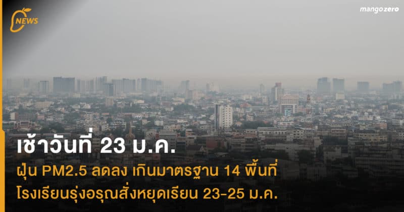 เช้าวันนี้ (23 ม.ค.) กรมควบคุมมลพิษได้รายงานสถานการณ์ฝุ่นละออง PM 2.5 โดยระบุว่าในวันนี้ค่าฝุ่นละอองลดลงจากเมื่อวานในทุกพื้นที่ มีค่าฝุ่นละอองที่ยังเกินมาตรฐาน อยู่ในระดับเริ่มมีผลกระบต่อสุขภาพอยู่ 14 พื้นที่ พื้นที่ริมถนน เกินค่ามาตรฐาน 9 พื้นที่ ได้แก่ ริมถนนกาญจนาภิเษก เขตบางขุนเทียน, ริมทางคู่ขนานพระราม 2 อ. เมืองสมุทรสาคร, ริมถนนลาดพร้าว ซอยลาดพร้าว 95 เขตวังทองหลาง, ริมถนนพระราม 3-เจริญกรุง เขตบางคอแหลม, ริมถนนพระราม 3 เขตยานนาวา, ริมถนนพหลโยธิน เขตจตุจักร, ริมถนนลาดกระบัง เขตลาดกระบัง, ริมถนนรัชดาภิเษก-ท่าพระ เขตธนบุรี, ริมถนนพหลโยธิน เขตบางเขน และริมถนนพระราม 2 เขตบางขุนเทียน พื้นที่ทั่วไป เกินค่ามาตรฐาน 5 พื้นที่ ได้แก่ ต.ทรงคนอง อ. พระประแดง จ. สมุทรปราการ, ต.อ้อมน้อย อ.กระทุ่มแบน จ.สมุทรสาคร, แขวงพลับพลา เขตวังทองหลาง, ต.นครปฐม อ.เมือง จ.นครปฐม, แขวงคลองกุ่ม เขตบึงกุ่ม ทั้งนี้ปริมาณฝุ่นในพื้นที่สีแดง (มีผลกระทบต่อสุขภาพ) ได้ลดลงจนกลับมาอยู่ในระดับเริ่มมีผลต่อสุขภาพ ส่วนเขตพญาไท ค่าฝุ่นลดลงจนอยู่ในระดับคุณภาพอากาศดี และทางกรมควบคุมมลพิษคาดการณ์โดยรวมว่า ในวันพรุ่งนี้ 24 ม.ค. 62 จากการพยากรณ์ และแบบจำลองของกรมอุตุนิยมวิทยา “การลอยตัวของอากาศจะดีขึ้น ลมพัดแรงขึ้น” และอาจทำให้ฝุ่นละอองมีโอกาสเจือจางลงได้ ในขณะเดียวกัน ทางกรมควบคุมมลพิษรวมถึงหน่วยงานที่เกียวข้อง ก็ยังคงดำเนินการแก้ไขปัญหาฝุ่นละอองอยู่ เช่น ล้างถนนทุกวันทุกสาย ฉีดละอองน้ำในอากาศเพื่อเพิ่มความชื้น ตรวจจับรถควันดำเกินค่ามาตรฐาน การทำฝนเทียม และห้ามเผาในที่โล่ง แม้ดูเหมือนว่าว่าค่าฝุ่นละอองจะลดลงเรื่อยๆ แต่จากการรายงานเมื่อวานที่พื้นที่ฝั่งธนบุรีตกเป็นพื้นที่สีแดง ฝุ่นละอองอยู่ในระดับมีผลกระทบต่อสุขภาพ ทำให้โรงเรียนรุ่งอรุณ ซึ่งตั้งอยู่ในโซนพระราม 2 ประกาศหยุดเรียน ตั้งแต่วันที่ 23-25 ม.ค. และเตือนนักเรียนให้หลีกเลี่ยงการออกจากบ้านเพื่อหลีกเลี่ยงฝุ่นละอองด้วย ที่มา : กรมควบคุมมลพิษ, โรงเรียนรุ่งอรุณ