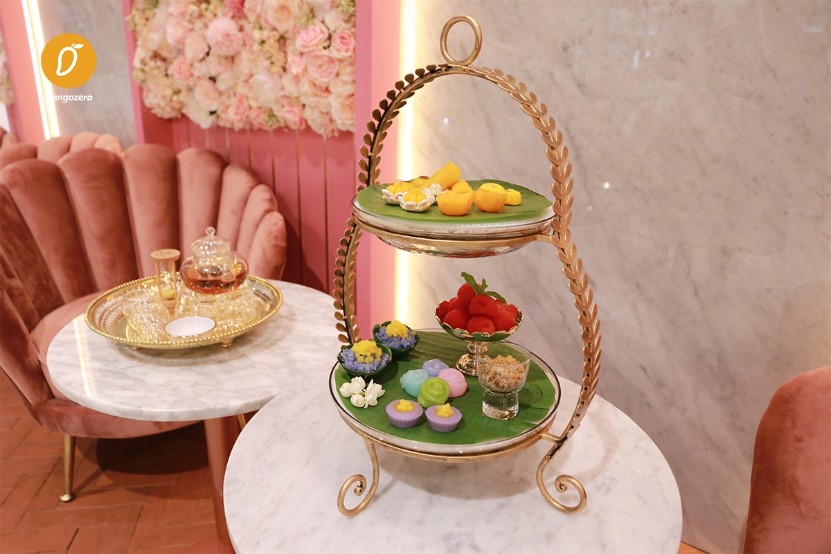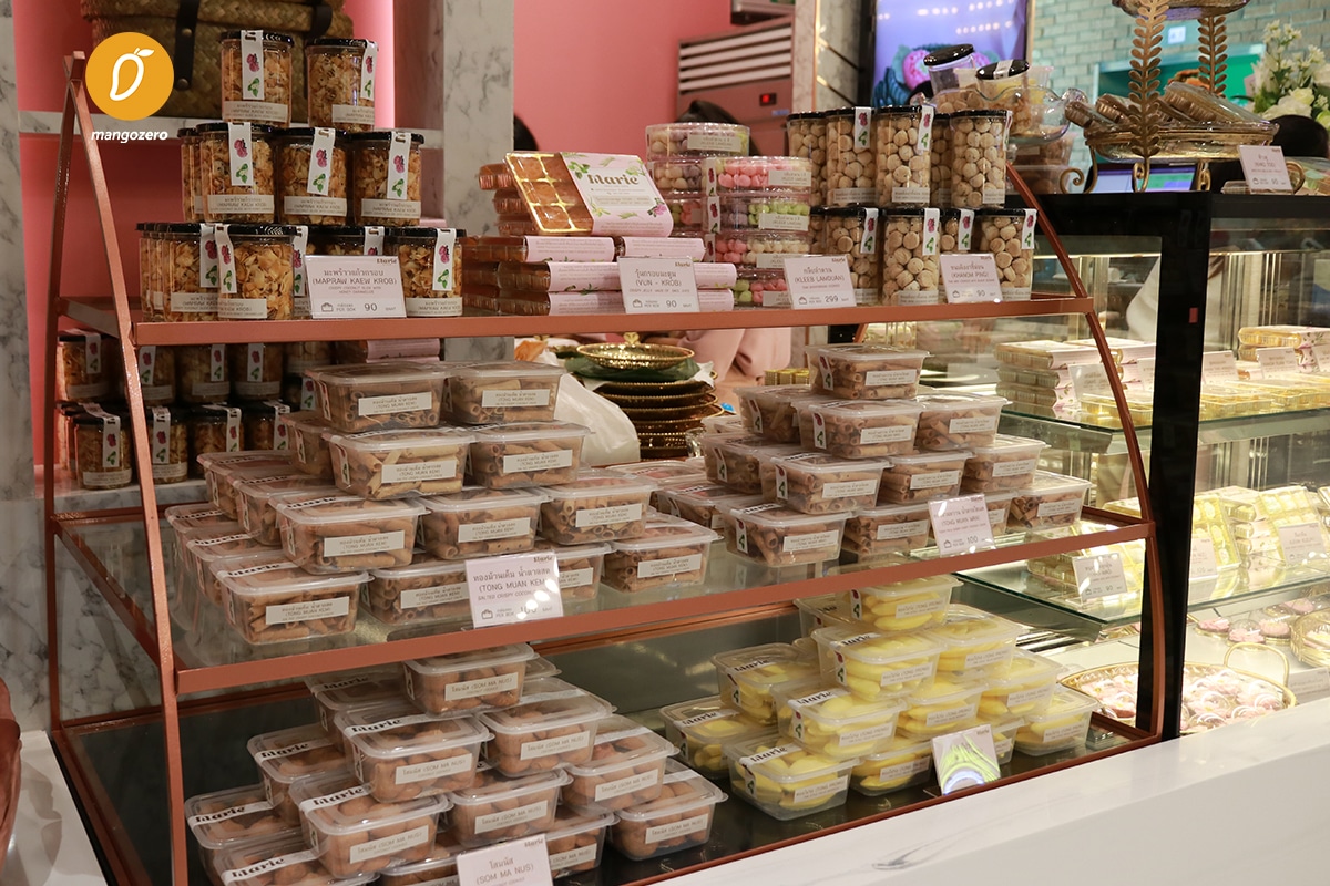 “กินคาวไม่กินหวานสันดานไพร่” หลายๆ คงเคยได้ยินสำนวนนี้กันมาบ้าง ดังนั้นจะพาไปชิมขนมหวาน ซึ่งเป็นขนมไทยแต่ทันสมัยสไตล์โมเดิร์น พร้อมจิบชาแกล้มขนมด้วย ที่ร้าน MARIE ซึ่งได้เชฟฝีมือดีมารังสรรค์เมนู พร้อมบรรยากาศร้านที่ดูสดใส จนคุณอยากนั่งทานไปยาวๆ MARIE 99 ชุดขนมไทยที่จัดวางมาอย่างสวยงามด้วยการผสมผสานขนมเครื่องทองชั้นสูงที่มีความหมายมงคลประกอบด้วยทองเอกเสน่ห์จันทร์ดาราทองฝอยทองรังไหมทองหยิบรวมถึงขนมไทยประยุกต์ประกอบด้วยขนมชั้นบุหลันดั้นเมฆข้าวเหนียวหน้าไข่แมงดาแตงโมปลาแห้งอุริต ชาดอกไม้ของ MARIE ชาดอกบัวหลง ครั้งนี้ผู้เขียนได้ลอง ชาดอกบัวหลง ทางร้านได้จัดเสิร์ฟมาในเหยือกแก้ว พร้อมแก้ว 2 ใบ โดยมีขั้นตอนง่ายๆ ก่อนดื่มชา ซึ่งให้พักชาไว้ 3 นาทีเพื่อให้ชาละลายเข้ากับน้ำจากนั้นให้ยกชาออกมาพักไว้แล้วรินชาใส่แก้วแนะนำว่าให้ดมกลิ่นก่อนดื่มเพื่อกระตุ้นกลิ่นรับรส ส้มฉุน เป็นเมนูขนมหวานที่หาทานได้ยาก สำหรับร้านนี้ได้จัดเสิร์ฟได้อย่างสมบูรณ์แบบ ซึ่งกลิ่นหอมคละคลุ้งทันทีหลังเปิดฝาออกมา ภายในถ้วยประกอบด้วย ลิ้นจี่ มะยงชิด และส้ม ซึ่งร้านกระซิบว่าจะเลือกใช้ผลไม้ตามฤดูกาลที่มีรสเปรี้ยวและหวาน โดยทานคู่กับขิงอ่อน (ใครที่ไม่ชอบทานขิงสามารถทานเมนูนี้ได้เพราะกลิ่นไม่แรงและไม่เผ็ด) ตามด้วยหัวหอมเจียวและโรยหน้าด้วยถั่วลิสง วิธีทานเพียงเทน้ำน้ำส้มซ่าเครี่ยวกับน้ำเชื่อมแบบโบราณจากนั้นคนให้เข้ากันตักทานผลไม้ใดก่อนก็ได้ให้ตักขึ้นมาพร้อมกับเครื่องต่างๆเมื่อทานไปแล้วจะรู้สึกสดชื่นดับร้อนได้ดีผู้เขียนชอบเมนูมากๆแนะนำเลยจ้า นารีจำแลง แค่ชื่อก็สวยงามเมื่อเห็นขนมแล้วยิ่งไม่กล้าทานเข้าไปอีกเห็นครั้งแรกถึงกับตะลึงเพราะสาวยมากกทางร้านเสิร์ฟมาในถาดทองประกอบด้วยมะยงชิดสอดไส้ด้วยข้าวเหนียวมูนทานคู่กับน้ำกะทิลอยดอกไม้และอาลัวสดดอกดาวเรืองฝรั่งเศสรสชาติไม่หวานมากเหนียวหนึบกำลังดีเป็นเมนุที่ไม่ควรพลาด ทุเรียนเชื่อม เมนูนี้มีเสิร์ฟเฉพาะช่วหน้าร้อน (พฤษภาคม – กรกฎาคม ) เท่านั้นสำหรับทุเรียนเชื่อมทางร้านจะคัดทุเรียนเกรดอย่างดีนำมาเชื่อมน้ำลอยดอกมะลิใบเตยทานคู่น้ำกะทิลอยดอกไม้รสชาตินุ่มกลิ่นทุเรียนไม่แรงเลยค่ะให้ความรู้สึกเหมือนกินขนมส่วนใครที่สนใจเมนูนี้ต้องสั่งล่วงหน้าก่อนนะคะเพราะว่ามีจำนวนจำกัด นอกจากนี้ยังสามารถเลือกซื้อขนมไทยกลับไปทานที่บ้านได้อีกด้วย มีเมนูให้เลือกเพียบ เช่น โสมนัส กลีบลำดวน หรือจะเลือกซื้อขนมไทยตามสั่งแล้วให้พนักงานจัดใส่กล่องให้สวยงามได้ด้