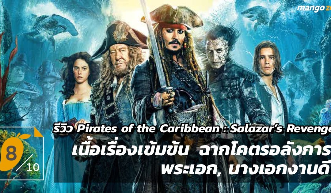 [8/10] รีวิว ‘Pirates of the Caribbean : Salazar’s Revenge’ สงครามแค้นโจรสลัดไร้ชีพ กลับมาอีกครั้งกับตำนานภาคต่อของ Pirates of the Caribbean ภาพยนตร์โจรสลัดแนวแฟนตาซี ที่ทำให้เราหลุดไปในยุคของโจรสลัด ในตอนจบของแต่ละภาคก็ทิ้งปมที่ทำให้เราอยากดูภาคต่อกันเหลือเกิน ซึ่ง Pirates of the Caribbean ภาคนี้กำกับโดย Espen Sandberg และ Joachim Ronning แอบบอกก่อนนะว่าในบทความนี้จะมีสปอยล์ในส่วนของภาค 1-4 ด้วย เรื่องย่อของ Pirates of the Caribbean : Salazar’s Revenge เป็นการกลับมาจากโลกแห่งความตายของซาลาซาส์ อดีตทหารหนุ่มชาวสเปนผู้เคียดแค้นโจรสลัด โดยเฉพาะ แจ็ก สแปร์โรว์ พระเอกของเราจึงถูกไล่ล่าโดยกองทัพคนตาย เฮนรี่ ลูกชายของวิล เทอร์เนอร์พยายามที่จะช่วยเหลือพ่อที่ถูกคำสาปและกลายเป็นกัปตันของเรือฟลายอิ้ง ดัทช์แมนในภาคก่อน การลบล้างคำสาปจำเป็นต้องใช้ตรีศูลในตำนานที่อยู่ในเกาะลึกลับแห่งหนึ่ง และเมื่อแจ็ก สแปร์โรว์ได้ตรีศูลมา ก็จะสามารถเอาชนะซาลาซาส์ได้เช่นกัน ทั้งสองจึงมีจุดประสงค์เดียวกัน เฮนรี่จึงร่วมมือกับแจ็ก สแปร์โรว์ และสาวนักดาราศาสตร์ซึ่งเป็นเพียงคนเดียวที่รู้วิธีการเดินทางตามหาตรีศูล ความสนุกของภาพยนตร์ภาคต่อ เนื้อเรื่องในภาคนี้ ซึ่งเป็นภาคที่ 5 ก็จะต่อเนื่องจากเนื้อเรื่องของภาคเดิม โดยเรียง Timeline ต่อๆ กันมาไม่มีอะไรซับซ้อน ใครที่ไม่เคยดูภาคก่อนหน้านี้ก็พอดูสนุกอยู่นะ แต่ถ้าเก็บภาค 1-4 มาก่อนก็จะครบรสขั้นสุด เราจะได้เห็นตัวละครจากภาคเก่าออกมาแบบโคตรเท่จนขนแขนลุก (จริงๆ นะ) และเนื้อเรื่องที่ปิดจบและคลายปมอย่างสวยงาม สุดยอดความอลังการของ Special Effect ในภาคนี้จะได้เห็นความอลังการของสเปเชียลเอฟเฟคที่จัดเต็มมากๆ และเนียนไปกับเนื้อเรื่องทำให้เหมือนกับเราหลุดเข้าไปอยู่ในโลกของโจรสลัดในหนังด้วยเลย อย่างเรือผีของซาลาซาส์ที่ลอยเกยขึ้นมาทับเรือชาวบ้าน หรือฉากที่ทะเลแยกออกเป็นสองส่วน (มันมีอยู่ใน Trailer นะ เราไม่ได้สปอยล์) สุดยอดความอลังการของ Special Effect ในภาคนี้จะได้เห็นความอลังการของสเปเชียลเอฟเฟคที่จัดเต็มมากๆ และเนียนไปกับเนื้อเรื่องทำให้เหมือนกับเราหลุดเข้าไปอยู่ในโลกของโจรสลัดในหนังด้วยเลย อย่างเรือผีของซาลาซาส์ที่ลอยเกยขึ้นมาทับเรือชาวบ้าน หรือฉากที่ทะเลแยกออกเป็นสองส่วน (มันมีอยู่ใน Trailer นะ เราไม่ได้สปอยล์) ความแฟนตาซีทำให้เรื่องตื่นเต้น แต่มากไปก็ขาดเสน่ห์ของโจรสลัด ความแฟนตาซีที่ทำให้เนื้อเรื่องสนุกตื่นเต้นและได้ลุ้นว่าจะเห็นอะไรใหม่ๆ ที่น่าตื่นตาตื่นใจ แต่ในขณะเดียวกันก็ทำให้บทมันอยู่ๆ จะเสกอะไรขึ้นมาก็ได้ โดยเฉพาะตัวละครที่ตายไปแล้วก็ฟื้นกลับขึ้นมารัวๆ อย่าง บาบอสซ่