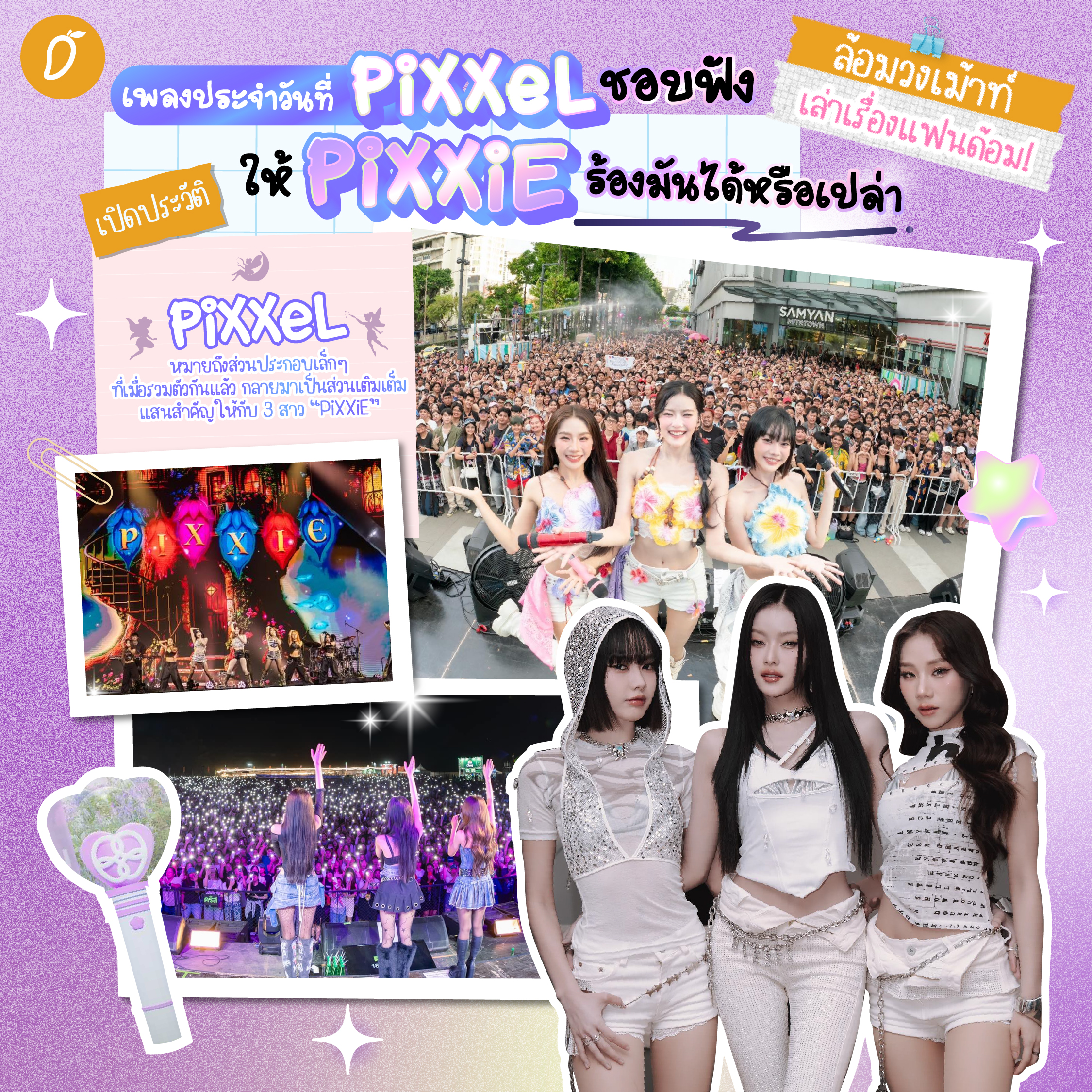 เผลอแป๊บเดียวก็มาจนถึงวันสุดท้ายของปี 2025 แล้ว บอกเลยว่าช่วงนี้ไม่ว่าจะหันไปทางไหน ทุกคนก็น่าจะสัมผัสได้ถึงบรรยากาศสุดคึกคักในวงการ T-POP จากการที่เหล่าศิลปินต่างได้แวะเวียนไปเสิร์ฟสเตจปังๆ บนเวทีงานสิ้นปีตามสถานที่ต่างๆ นับเป็นช่วงเวลาแห่งการงัดผลงานออกมาโชว์ พร้อมปลดปล่อยเอเนอร์จีแบบสุดเหวี่ยงเลยก็ว่าได้ วันนี้พี่แมงโก้จึงขออาสาเป็นส่วนหนึ่งของการส่งมอบรอยยิ้มและพลังดีๆ ผ่านการชวนทุกคนมาล้อมวงเม้าท์เล่าเรื่องแฟนด้อมกันต่อใน Chapter ที่ 6 ซึ่งแฟนด้อมที่เราจะหยิบมาเม้าท์กันในวันนี้ หลายๆ คนอาจจะเคยคุ้นหน้าคุ้นตาอยู่บ้าง เพราะศิลปินของพวกเขาเป็นหนึ่งในเกิร์ลกรุ๊ปตัวแม่แห่งวงการ ผู้เปิดตัวมาพร้อมภาพลักษณ์ 3 สาวภูติจิ๋ว แต่ความสามารถกลับไม่เคยจิ๋วตาม! บอกใบ้ขนาดนี้หลายคนคงเดาได้แล้วว่าแฟนด้อมที่พี่แมงโก้จะชวนมาเม้าท์ในวันนี้ ก็คือเหล่า “PiXXeL” ผู้คอยมอบความรักให้กับ 3 สาวภูติจิ๋วอย่าง “PiXXiE” มาโดยตลอดนั่นเอง ถ้าอย่างนั้นอย่ารอช้า…ขอชวนทุกคนมาต้องมนตร์สะกดความน่ารักของแฟนด้อมนี้ไปพร้อมๆ กันได้เลย ชวนรู้จักกับเหล่า PiXXeL ชื่อนี้ท่านได้แต่ใดมา! 💜 สำหรับชื่อ “PiXXeL” มีความหมายว่าชิ้นส่วนเล็กๆ ที่เมื่อประกอบรวมกันแล้วกลายมาเป็นส่วนสำคัญสำหรับ 3 สาว PiXXiE โดยมีสีประจำแฟนด้อมเป็นสีม่วงไลแลคนั่นเอง ยิ่งไปกว่านั้น สาวๆ PiXXiE ยังมีบทเพลงสุดพิเศษอย่าง “เพลงประจำวัน (PiXXeL)” มอบไว้ให้กับแฟนๆ อีกด้วย ซึ่งบทเพลงนี้ก็เต็มไปด้วยเนื้อหาน่ารักๆ เพื่อส่งมอบพลังบวก ทั้งยังปิดจบด้วยคำบอกรักและให้กำลังใจจากทั้ง 3 สาว เหมาะกับการเปิดฟังในทุกๆ วัน หรือถ้าหากได้เปิดฟังในวันเหนื่อยๆ ก็ถือเป็นยาใจชั้นดีที่ช่วยให้ยิ้มได้ทันทีเชียวแหละ “พักบ้างหรือยัง เป็นกำลังใจให้อยู่นะ ขอบคุณที่อยู่ข้าง ๆ มาเสมอ” 💖 ✨ นี่คือ 3 สาว PiXXiE ที่เป็นนางฟ้าตัวน้อยของ PiXXeL มาตลอด 3 สาว PiXXiE ผู้ร่ายมนตร์ให้ PiXXeL ต้องตกหลุมรักซ้ำๆ ประกอบไปด้วย พิมมา พิมพ์มาดา, มาเบล สุชาดา และอิงโกะ อินท์ปาลี พวกเธอเปิดตัวในฐานะศิลปินจากค่ายเพลง LIT ENTERTAINMENT และปล่อยผลงานแรกในชื่อเพลง “เด็ด (DED)” เมื่อวันที่ 11 กุมภาพันธ์ 2564 นำเสนอภาพลักษณ์ที่เต็มไปด้วยความสดใส ขี้เล่น และซุกซน สมกับคอนเซปต์ 3 สาวภูติจิ๋วที่แต่ละคนต่างมีสไตล์เฉพาะตัว ⚡️ เอเนอร์จีตลอดปีที่ PiXXeL – PiXXiE มีให้กัน! สำหรับแฟนด้อม PiXXeL นั้นถือว่าเป็นที่เลื่องลืออย่างมากในฐานะของ “แฟนด้อม Introvert” เพราะปกติแฟนๆ มักจะชอบร้องเพลงตาม 3 สาวแบบเบาๆ เพื่อดื่มด่ำกับโชว์อย่างเต็มที่ พร้อมส่งยิ้มหวานเป็นกำลังใจ จนแฟนด้อมเพื่อนบ้านทั้ง